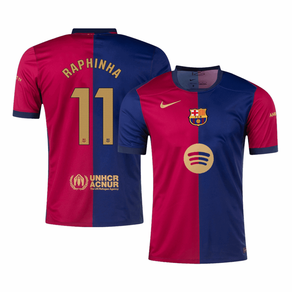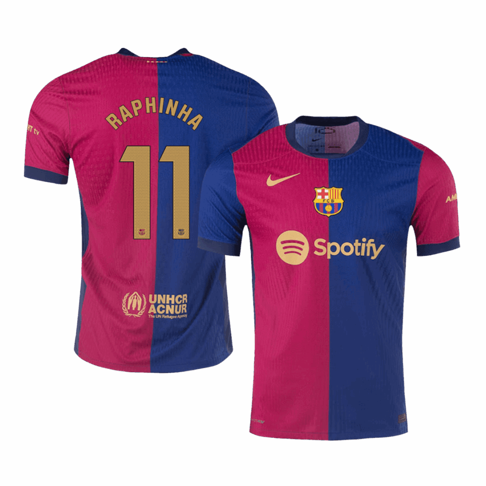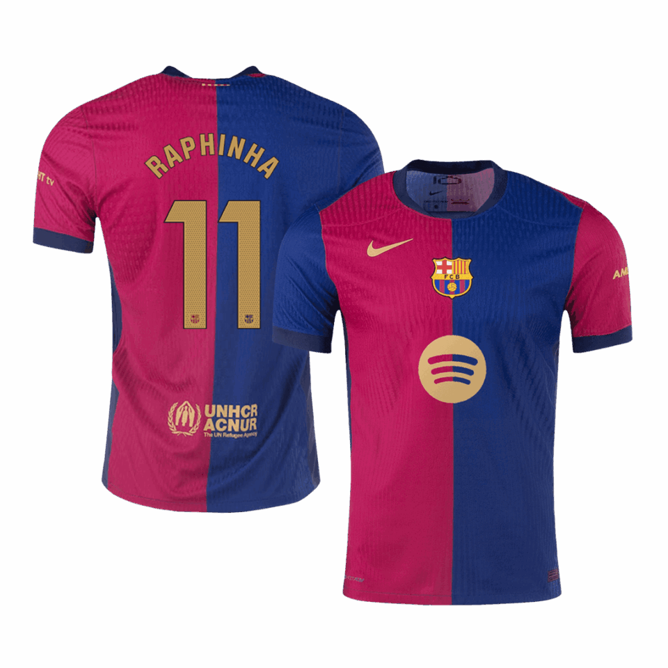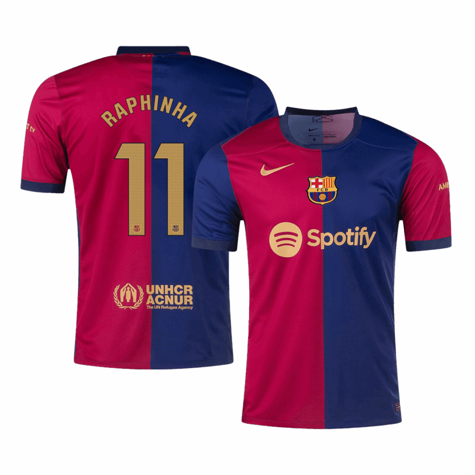 RAPHINHA #11 Barcelona Home Soccer Jersey 2024/25 – Spotify Logo Without Text